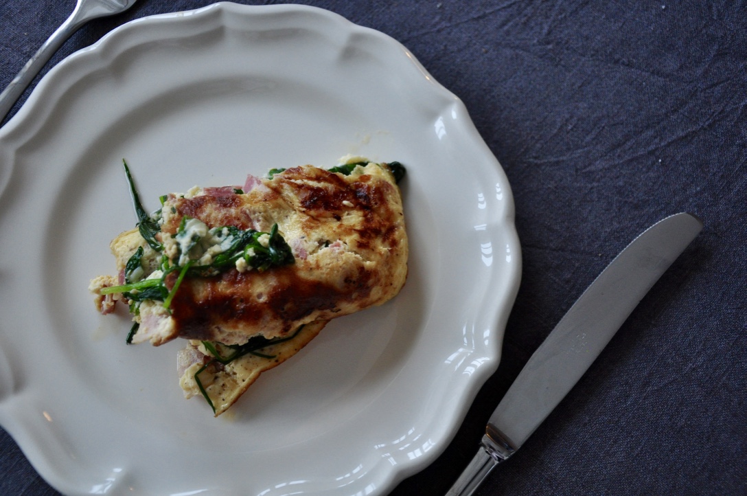 Pour commencer, une grande classique fort pratique, l’omelette. Pas besoin de recette pour en faire une et c’est tant mieux car qui à le temps pour ça un mardi midi ? Les miennes pour deux adultes sont souvent composés de trois oeufs, d’une bonne dose de lait entier (10cl au moins) et de ce qu’il y a à ce moment dans le frigidaire. Ma préférée demeure surement celle à la poitrine fumée et aux épinards qu’on trouve ici plantés dans de petits pots mais il y a tellement de variantes possibles. Fromage râpé et légumes racines qui accompagnaient le poulet rôti de la veille, chèvre et poireaux, pommes de terre et jambon, une généreuse poignée d’herbes aromatiques et du parmesan… Je fais bien chauffer la poêle à l’avance et avant d’y verser la préparation aux oeufs j’ajoute une généreuse noisette de beurre pour obtenir un résultat joliment doré. La cuisson sous le couvercle prend quelque 10 minutes au feu moyen. Et la voilà, votre omelette, dorée en dessous, aérée à souhait et si réconfortante un jour où la neige fondue ne cesse de tomber et les rues perdent de leur praticabilité à vue d’oeil.