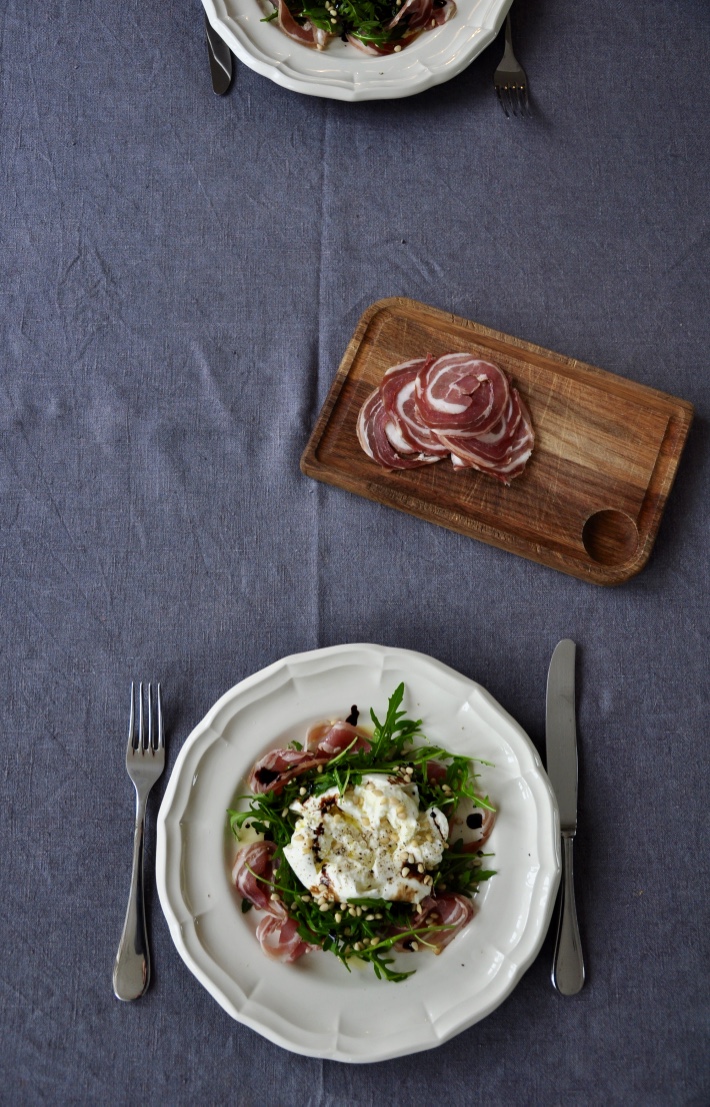 Cela m’a pris du temps mais en France j’ai appris à apprécier la salade verte. Celle qu’on mange après le plat principal, avec un peu de fromage si affinité. Eh bien, dans les contrées du nord cette habitude est inexistante et la plupart du temps vous trouverez votre laitue noyée dans une sauce à la crème et au sucre en accompagnement pour ledit plat. Ce n’est pas mauvais, du tout, au contraire mais on est assez loin de l’idée d’une petite bouchée rafraîchissante avant de s’attaquer aux desserts. Et ça me manque. Je n’en consomme pas des quantités gargantuesques comme Monsieur mais n’empêche… quelques feuilles ici et là, avec un peu de vinaigrette égaye l’assiette. Du coup je fais un compromis. Un peu pour aller avec l’omelette, un peu avec la quiche et de temps en temps, une salade composée. Celle-ci est fortement inspirée par les jours d’été remplis de chant des cigales et des nuits qui exhalent encore la chaleur accumulé en journée. Toujours pour deux j’ai mis deux boules de mozzarella di buffala, 8 tranches de pancetta, deux belles poignées de roquette, des pignons de pin grillés. Un peu d’huile d’olive, un tour de moulin à poivre et une réduction de vinaigre balsamique pour rehausser le tout. On est loin d’une insalata caprese traditionnelle et il va falloir patienter encore quelques mois avant de trouver des tomates locales mais en attendant cette variante n’est pas si mal que ça.