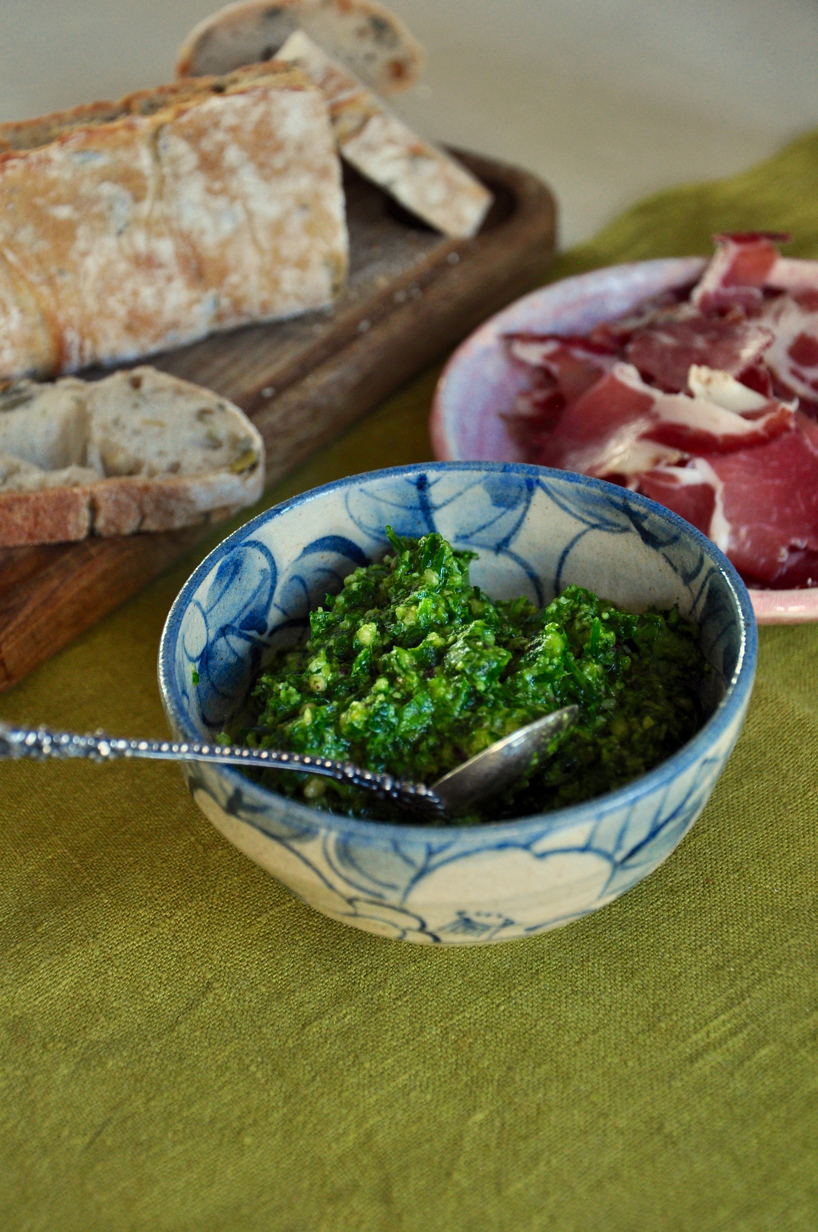 Nettoyer les herbes et écrasez les au mortier ou dans le petit bol du robot. Faites griller les pignons et ajouter à votre mélange ainsi que l’ail et enfin le parmesan. Continuer à réduire tous les ingrédients en une masse plus ou moins homogène afin d’obtenir la consistance souhaitée. Ajoutez l’huile. Beaucoup d’huile.